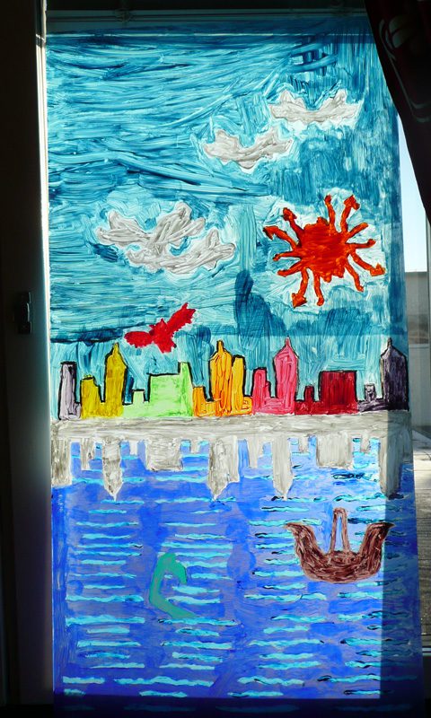 Måleri med akrylfärg på plexiglas till glasparti i trapphus